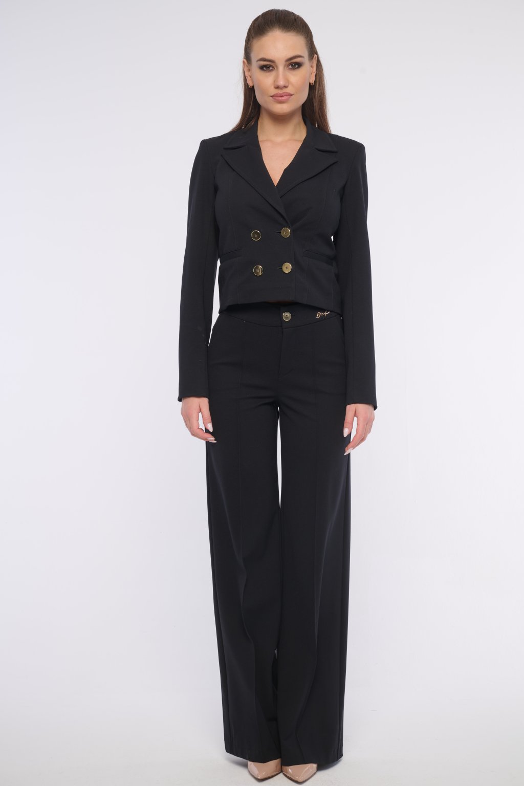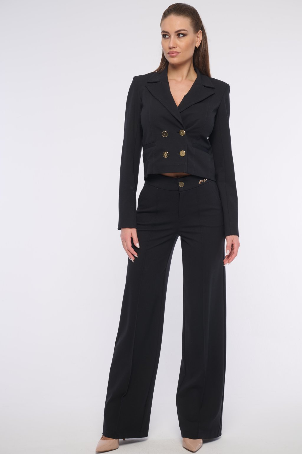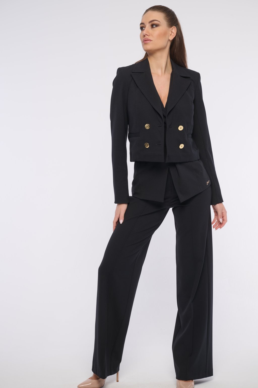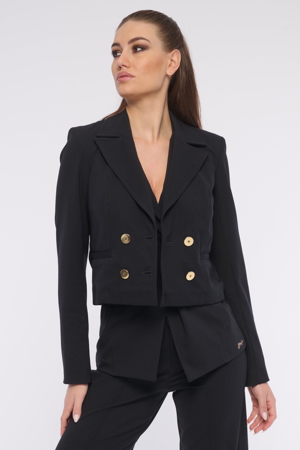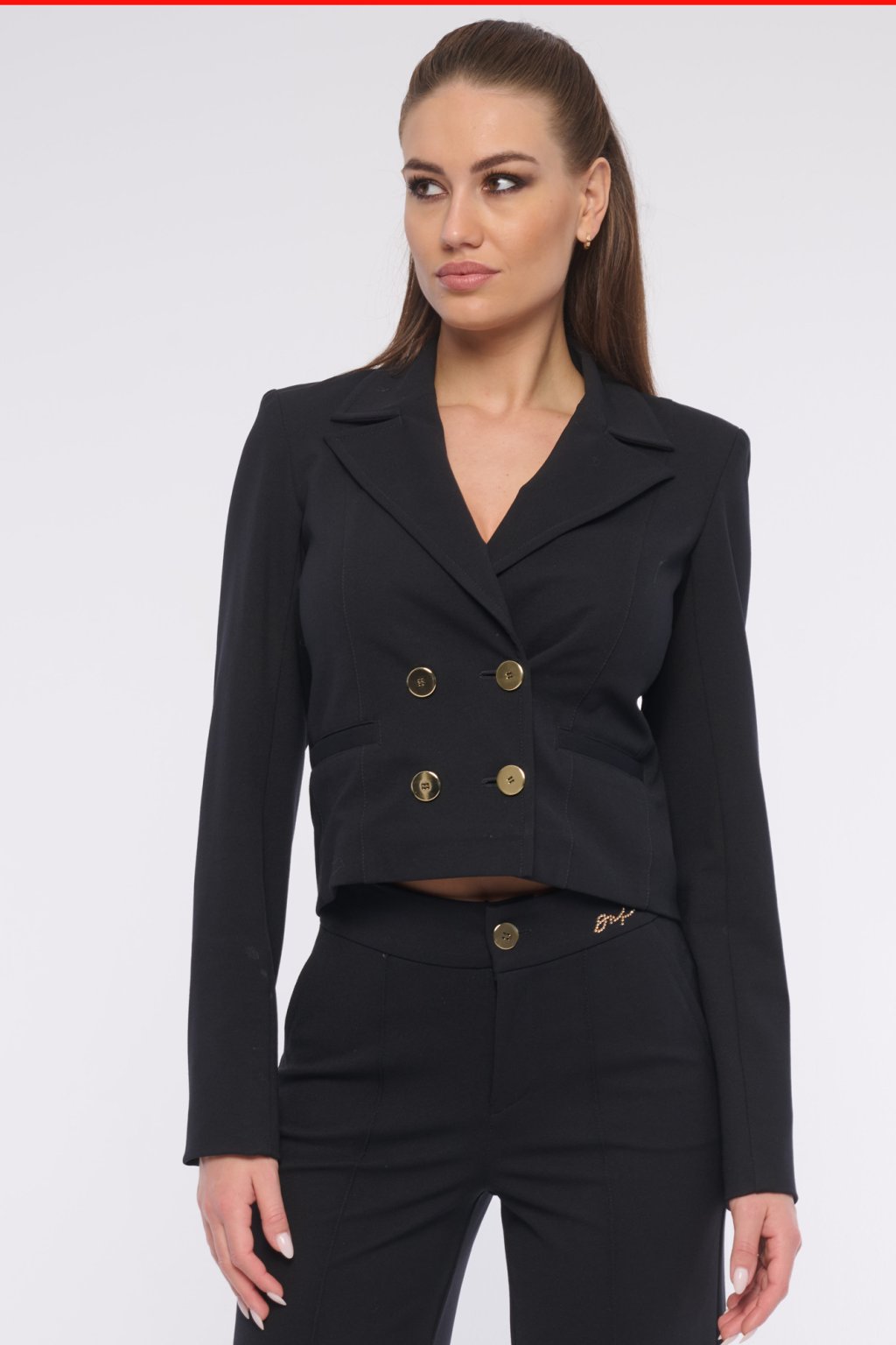 Moderní krátké sako s výraznými zlatými knoflíky.