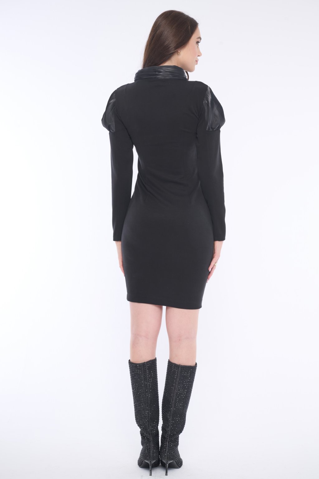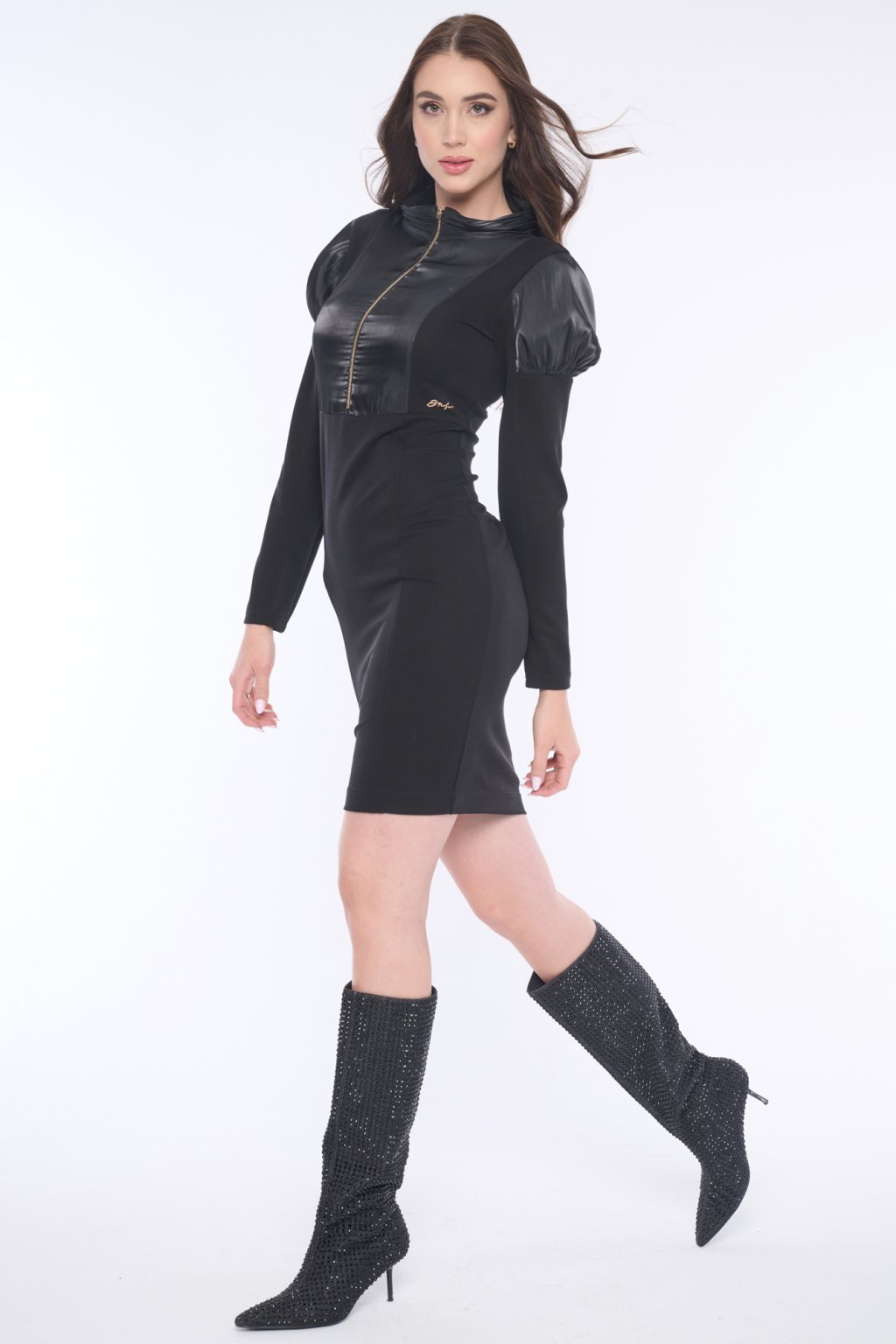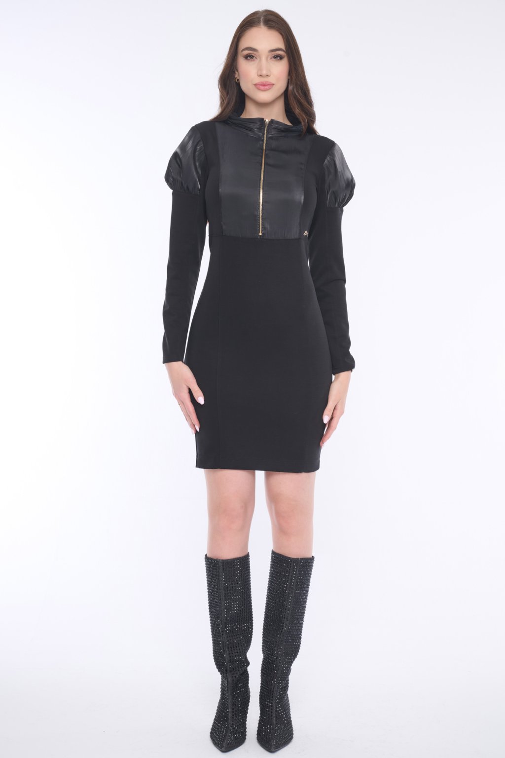 Šaty z jemného broušeného žebra "cupro", doplněné lesklou látkou s nabíranými rukávy. Krystaly Swarowski.