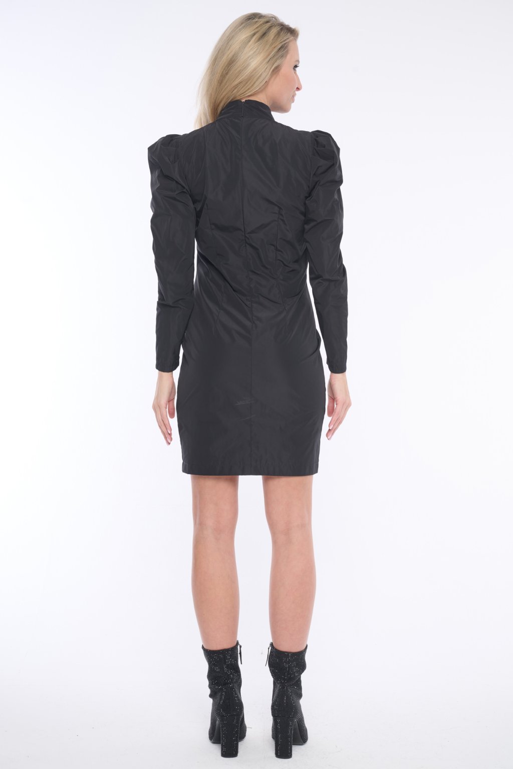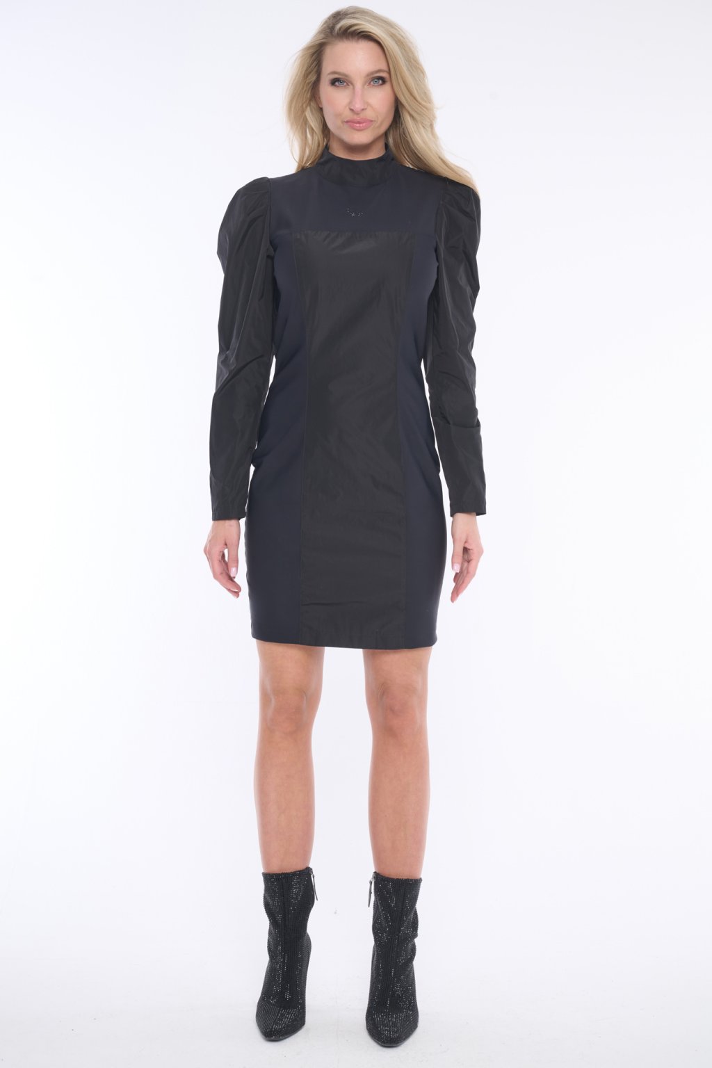 Koktejlové šaty s nabíranými rukávy. Kombinované s úpletem. Detaily ze šusťákového materiálu. Krystaly Preciosa.