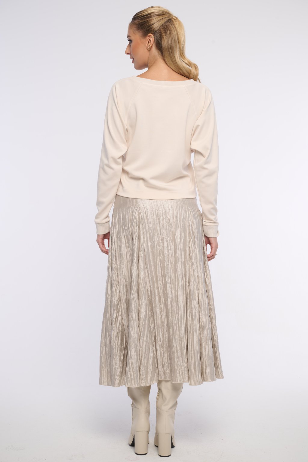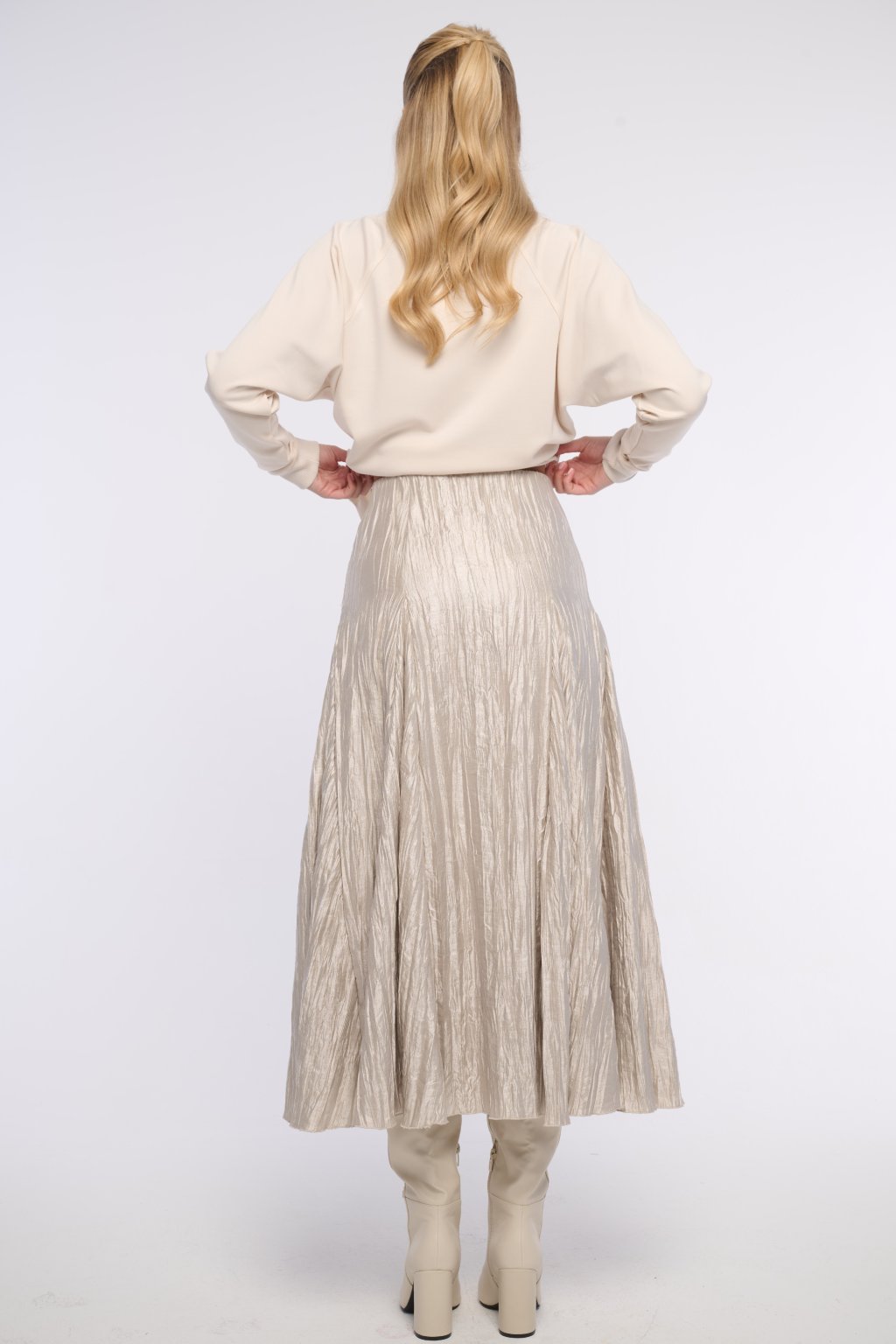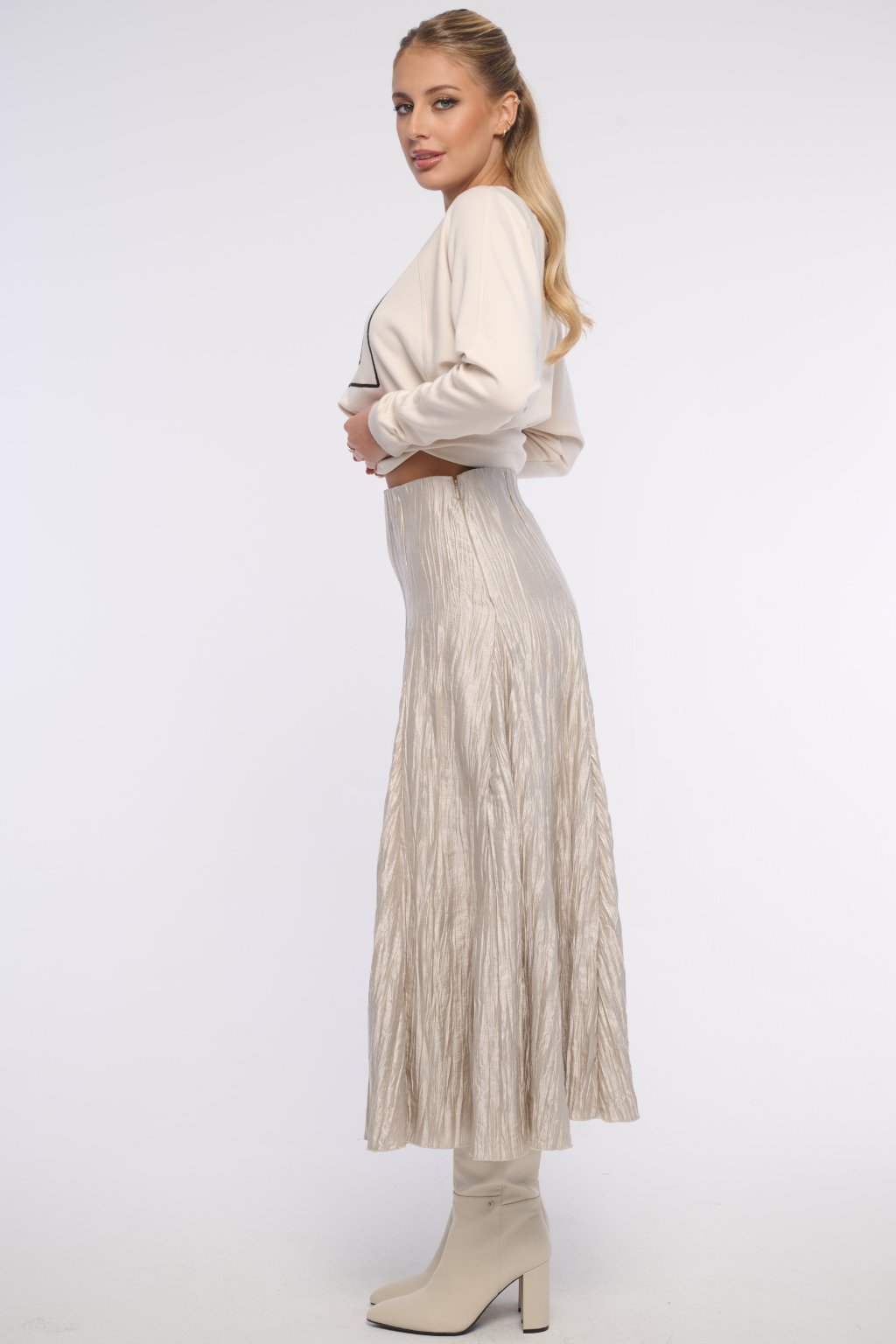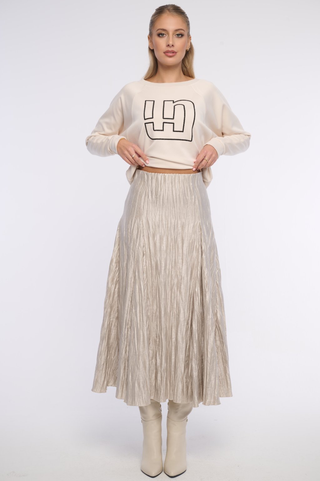 Široká sukně z crashovaného materiálu. Vhodná na všechny příležitosti. V pase na gumu. Logo z krystalů Swarovski.