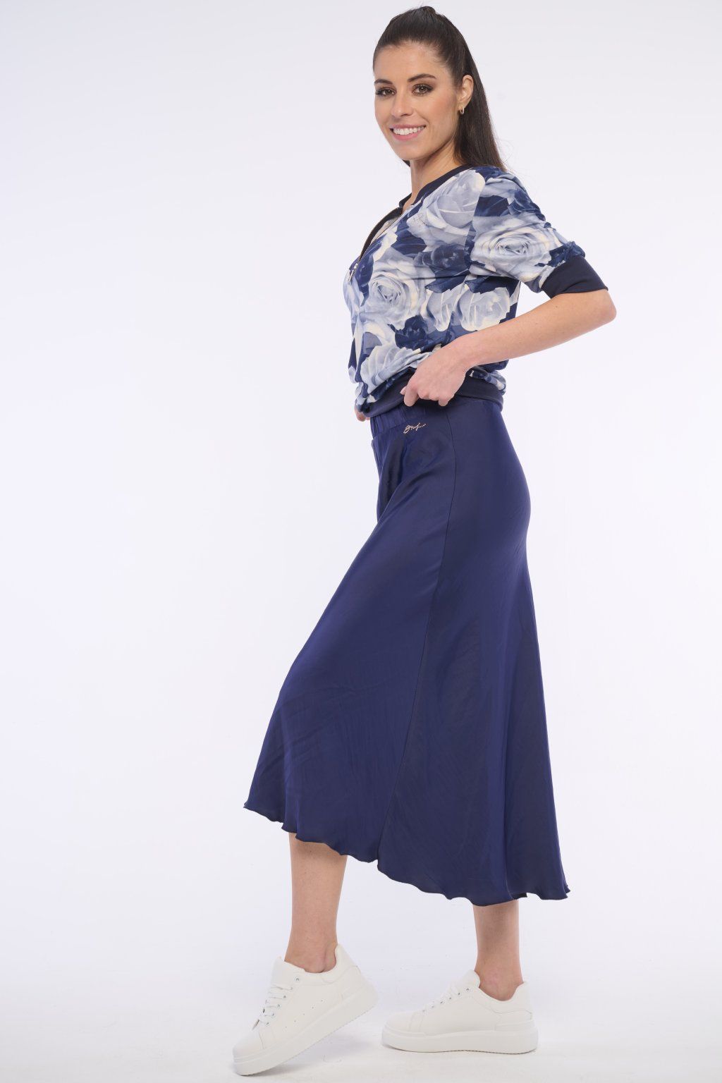 Sukně v pase do gumy. Logo z krystalů Swarowski.