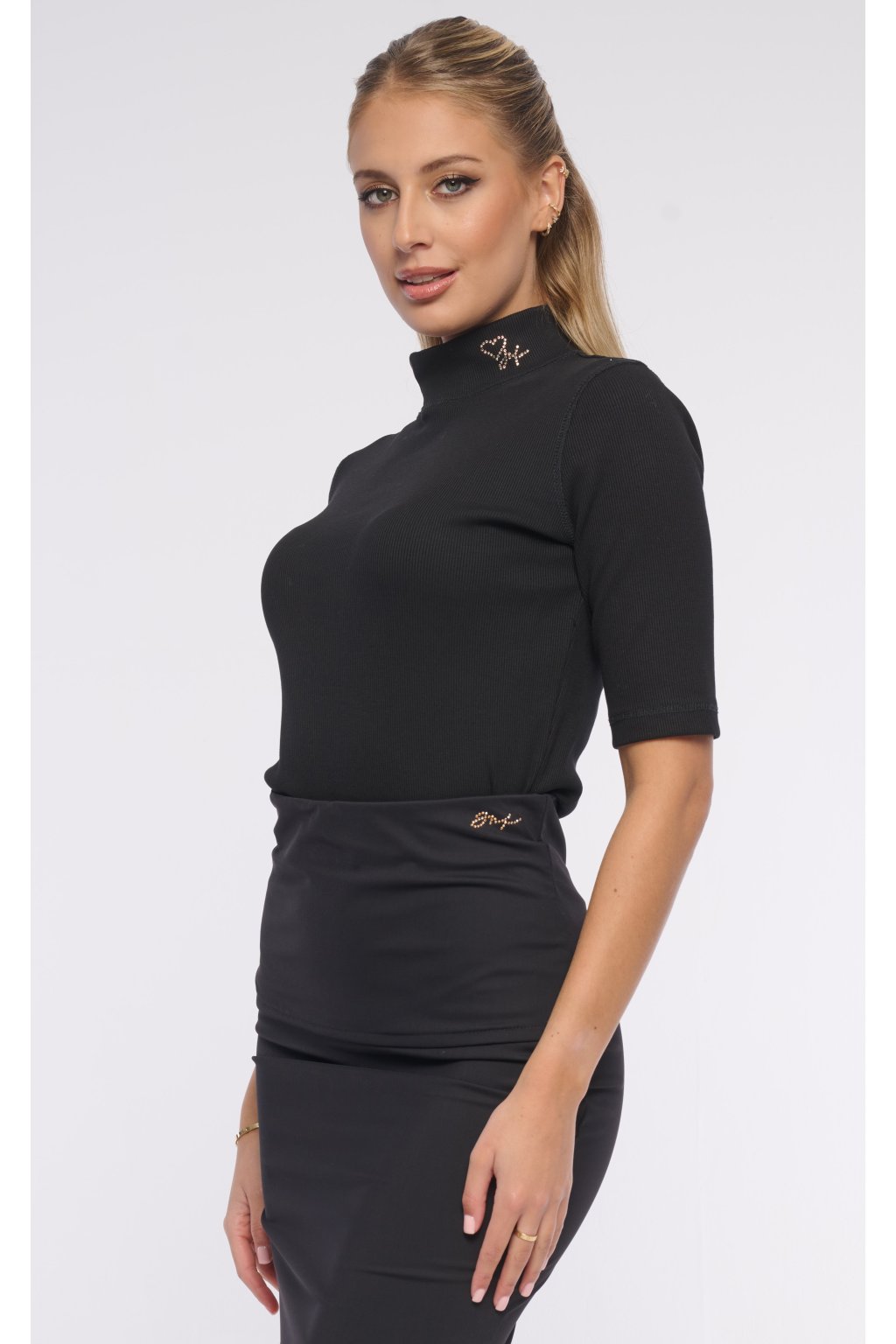 Triko s krátkým rukávem ze žebrového úpletu se stojáčkem. Logo z krystalů Preciosa.